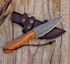 This beautiful everyday carry fixed blade skinner knife feels great in your hand and is suitable for field dressing, Butchering Game, Outdoor Survival, Camping, and any smaller cutting task. Great multipurpose tool for indoors or outdoors. Our high-end Damascus steel custom handmade well-balanced hunting dagger knife is hand-forged Damascus steel; pattern-welded in-house combining 1095 tool steel and 15N20 nickel tool steel. The hardness of this Damascus blade is rated at 55 to 58 HRC on the Rockwell scale which holds the sharpness for a long time. This hand-ground blade has heft and comfortable handling made for practical use. The entire knife is handmade at our facility from forging the Damascus billet to stitching the custom-fitted quality leather sheath with belt loop for easy fastening.