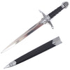 With the Dragon Hilt Dagger, you can experience the ferocious style of the mighty dragon. Its fantasy design is truly eye-catching. Made from stainless steel, this decorative dagger features a double-edged blade. The dagger has a highly detailed crossguard. In the center, there is a section that faces outward and runs onto the blade. It features a horned dragons head on one side. On each arm of the guard, there is a flame that reaches out towards the tip. The rest of the guard has a scaled pattern. The hilt of the dragon dagger continues with a black ridged grip. Then, it ends with a mushroom-shaped pommel. The pommel features the curled tip of the dragons tail. Finally, this fantasy dagger comes with a matching scabbard. It has metal fittings with a scaled pattern. A dragon adorns the chape of the scabbard.