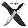 14" overall with a 7 1/4"440 stainless steel blade. Blade is designed with large serrations ontop with hole designs through out the blade. The handle is inlay edwith a wood insert and includes a sheath.