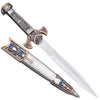 This beautiful dagger is an overall length of 14" and is constructed with stainless steel. The leaf blade is 7.5" long. This Viking Dagger is highly detailed and accented with brass coloured highlights and blue stones inlayed in the scabbard.