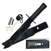 Weighing in at just under a pound, this heavy duty survival knife measures 15 inches overall and features a 9.5 inch 440 stainless steel blade that is very sharp. Sporting a black anodize finish that strengthens the steel and helps to prevent rust, the drop-point style blade can be honed to an even finer edge with the included sharpening stone. A 3.25 inch serrated sawback segment on the spine of the blade can be used to cut wood and other tough materials. The handle is also made from steel with a black rubberized textured grip; a screw-off butt cap hides a compass while a survival kit (including a fishing line with hook and weight, matches to start a fire and sandpaper) is enclosed right inside the handle. The cap also includes a lanyard loop with a lanyard included. The hard black nylon sheath has a snap button closure with a pocket to hold the sharpening stone.