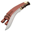 17 Inch overall Indian Gurkha Kukri Regimental Knife is sure a collector appeal, the high carbon steel handmade full-tang blade, exotic natural brown hardwood handle and copper steel butt plate make this rugged piece an ideal tool for the outdoorsman. The scabbard is also a masterpiece to possess. It is well covered with natural leather with a brass plated end cap. The scabbard also has a belt loop for easy carrying.