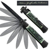 Our Milano is collectors dream. It features an all-black outlook with a faux green stained burn stag horn insert. The blade is drop point featuring a sharpen edge with a black anodize finish and the imprint of Milano Godfather Collection. Teflon spacers allow the spring assisted blade to open smoothly and locks into place solid with the liner locking system. It also features an easy closing mechanism. Just assist the flipper about 45 between the handle tangs and watch the spring does the rest.