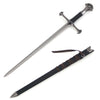 Made from stainless steel, this decorative sword has a straight, double-edged blade. The short sword continues with a cruciform crossguard. Each arm of the crossguard flares out into a fan shape at the end. Next, the handle has a black ribbed grip. Then the handle ends with a long pommel. The pommel has the same shape as the arms of the crossguard. Finally, this medieval sword comes with a black scabbard. It features a metal chape and throat. The top of the scabbard has a V-shape. It also has a brown leather belt.