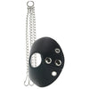 A sexy leather-look vinyl cuff snaps securely around the testicles, surrounding them in a snug parachute. Three evenly spaced chains link to the bottom of the cuff, strategically placed for an even 'drag'- the chains can be removed entirely to eliminate the more intense tug they provide, likewise, any orb or weight you already own could be clipped on to any point of the chain to increase that effect. Fits most.