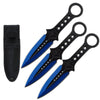 Features blue and black blades, with each knife measuring 7.5 inches overall. This three-piece throwing knife set provides a well balanced throw every time. The set includes three stainless steel throwers. It comes complete with a black nylon sheath for easy and safe transport.