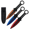 Each knife measuring 7.5 inches overall. This three-piece throwing knife set provides a well balanced throw every time. The set includes three stainless steel throwers. It comes complete with a black nylon sheath for easy and safe transport.