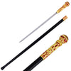 The cane shaft has been constructed from steel with a black glossy finish. Hidden inside of the black metal shaft is a 18” hidden blade made of stainless steel, which can be accessed by unscrewing the handle. The bottom of the cane features a tough rubber gripper. The head of the cane has been constructed from steel with golden and red carved.
