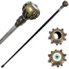 The cane shaft has been constructed from steel with a black glossy finish. Hidden inside of the black metal shaft is a 12” hidden blade made of stainless steel, which can be accessed by unscrewing the handle. The bottom of the cane features a tough rubber gripper. The head of the cane has been constructed from steel with Rolling Evil Eye With Skeletal Hand Handle.