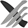This is a set of 3 knives with pointed handle. Small knife measures 6.25 " with blade 3.25", medium knife measures 8.5 " with 5" blade and large knife measures 10.5" with 6" blade. Made of 1045 Surgical Steel. Comes with a nylon case. Simple elegant design with a hole on the handle. Siiver in color .