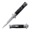 The Italian stiletto is one of the most iconic knives thanks to its rich heritage and time-tested styling. The knife features an integrated slide safety, a push-button operating system and the blade is released by the same button. This model features a black marble overlay handle complete with stainless steel bolsters, a single-edged bayonet style blade and comes with pocket clip. 9 Inches overall in length.