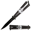 If you want to learn dangerous and impressive tricks then this is the knife for you. This pocket knife has two handles that counter-rotate around the tang such that, when closed, the blade is concealed within grooves in the handles. Both handles are made from stainless steel with a steel frame making this a durable double walled butterfly knife. Featured on the end is a safety latch. The handles features 3D print Skull Punisher. The blade sports a drop point style which is one of the most popular styles of blade around.