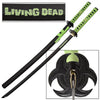 Face your foes head-on when the Living Dead Zombie Samurai hits! You will have nothing to fear when you wield this Zombie Killer Apocalypse Katana. Featuring a solid black finish carbon steel blade with Living Dead written in green ink on the blade and black painted zinc aluminum fittings and a bio-hazard tsuba, this katana will get the job done when anything stands in its way. The Living Dead Katana handle comes equipped with a Zombie green cord wrappings and black ray skin with a bio-hazard gold button on the sides which envelop the oversized handle. The black rough finish wooden scabbard features a green traditional bull-horn bow tie wrap. This is one katana the zombies will be running from.