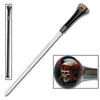 This is not just an ordinary sword cane. The handle is constructed with a clear acrylic coating allowing you to see the poly resin pirate skull that looms inside the top. Equipped with a 15 inch stainless steel blade that slides into the aluminum shaft with cast metal fittings and tip for precision balance. 34 1/4 inch Overall