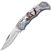 Eagle Bolster Handle shaped lockback folding pocket knife. This pocket knife with gift box case would make a great gift. The distinct and uniquely crafted pocket knife handle measures 4.25" long. The durable, fully functional stainless steel blade measures 3" long.