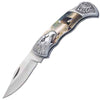 Eagle Bolster Handle shaped lockback folding pocket knife. This pocket knife with gift box case would make a great gift. The distinct and uniquely crafted pocket knife handle measures 4.25" long. The durable, fully functional stainless steel blade measures 3" long.