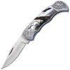 Eagle Bolster Handle shaped lockback folding pocket knife. This pocket knife with gift box case would make a great gift. The distinct and uniquely crafted pocket knife handle measures 4.25" long. The durable, fully functional stainless steel blade measures 3" long.