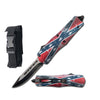 The clip point style blade of this automatic out the front knife is constructed from stainless steel, and features a black and metallic silver finish. This impressive OTF knife has a metal handle with 3D Confederate Flag Printed. The firing button is mounted on the side making the knife slim and easy to carry. The pocket clip is mounted on the back, as well as a handy glass breaker in case of emergency. Included with your purchase is a FREE black nylon pouch that you can attach to your belt to easily carry your knife wherever you go. 7 Inches overall in length when fully opened.