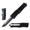 This Street Walker OTF knife features a two tone black and satin finish stainless steel tanto point style blade. The dual action allows you to use a slider trigger located on the side of the handle to propel the blade forward as well as retract. Talk about easy access! The handle itself is made from durable zinc alloy and has a diamond textured finish for a firm hold even in the toughest weather conditions. A steel pocket clip and handy emergency glass breaker are featured on the handle. Overall Length 7 inches with Handle Length of 4.15 inches. Includes FREE Nylon Pouch with Belt Loop.