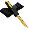 The Automatic OTF is an out the front knife with a stunning gold blade textured with a Damascus pattern that catches the light beautifully. This bright gold accents the matte black handle and makes the gold belt clip, glass breaker, and hardware show even more vividly. The switch is conveniently placed on the side of the handle for easy single-handed use. Included with the OTF is a nylon sheath equipped with a belt loop for easy carry.
