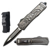 Our Stonewash Wolf Handle OTF is one of the most unique knives we've created. Custom engraved "Wolf" take over one side of the handle, which the other is covered in hard coat zinc alloy. The double edge spear point blade can be quickly deployed with the ambidextrous sliding button. Pushing forward on the button deploys the blade out the front of the handle and pulling backwards on the button retracts the blade back into the handle where it awaits to be deployed again in a moments notice.