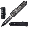 Our Stonewash Grim Reaper OTF is one of the most unique knives we've created. Custom engraved "Grim Reaper" and his nemesis take over one side of the handle, which the other is covered in hard coat zinc alloy. The double edge spear point blade can be quickly deployed with the ambidextrous sliding button. Pushing forward on the button deploys the blade out the front of the handle and pulling backwards on the button retracts the blade back into the handle where it awaits to be deployed again in a moments notice.