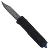 This powerful automatic dual action out the front knife is sure to tickle your fancy. The clip point style blade is made from 1095/15N20 Steels to create a gorgeous wave-pattern Damascus. When not in use, the blade is encased in the matte black zinc alloy handle. Use the silver switch on the side of the handle to deploy and retract the blade with little effort. The six sturdy hex screws holding the handle together, as well as the trusty pocket clip and glass breaker on the handle are anodized for a striking blue finish. A black nylon sheath is included with a quick release closure.