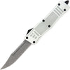 The handle of the knife is a stunning silver aluminum with a diamond pattern dead center for grip. Unique and beautiful Damascus steel composes the blade like a fervent melody. For contrast, the switch, hardware, and belt clip are midnight black. Simply push the switch up and the blade springs into action. Slide the switch back down and the blade retreats into the handle for safe storage and carry. The Screeching Metal OTF comes with a black nylon sheath equipped with a belt loop for convenience and safety.