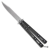 Sporting a silver clip point blade, the slim build and good weight of this balisong butterfly knife delivers nice action in an attractive package. Featuring textured inserts to provide a solid grip, the distinctive stainless steel handle is decorated with rounded cutouts that make this knife very light in weight but at the same time extremely durable. A metal safety latch is included to lock the blade into place when it is not in use as well as when it is deployed.