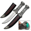 A ceremonial dagger that would make any modern druid proud! The design is both elegant and some what primal, very much like the life of the early celtics & druids that this dagger pays homage to. The dagger is made using a stainless steel blade with a gentle curved shape that is reminiscent of its jambiya roots, while the cast-metal handle and overall size make it more similar to the sgian dubh. The cast-metal hilt is decorated with an impressive Celtic knot design that includes a single pentagram decoration, while also featuring a small green faux gemstone accent on the pommel. Included with the dagger is a black scabbard with red Celtic knot designs, as well as a metal chape that features a small pentagram accent. Features: