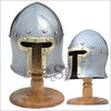 When you want the look of a medieval helmet but do not have the space for one, a mini helmet is ideal. This miniature has the same look as a full sized barbute helmet. This miniature medieval Barbute Helm is crafted from steel, it comes with a wooden mini helmet stand for display. It makes a fine office accessory, paperweight, or a notable defensive upgrade for the garden gnome. Fit with Adjustable buckle and leather strap.