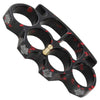 The Battle Crest of the Noble Warrior Knuckle is a beautiful piece for collectors and competitors alike with its large finger holes and gallant heraldry.  The red splashes on the black background coating this steel knuckle signify magnanimity, military strength, warriors and martyrdom.  The heraldry that sits atop each knuckle is a strong shield and two crossed battle-axes which symbolize authority and military duty.