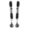 Tipped in softer black rubber, the high quality metal Clamps tighten easily with a twist of a screw up top. A pretty black bell bead attached to the end of each swings tantalizingly with movement- the tug of the clamps will intensify naturally along with movement as they dangle and dance. Spot clean