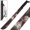 Featuring a unique and vivid Zombie image across the entire blade. Constructed from a solid slab of heavy duty stainless steel, this full tang bush machete is evenly weighted and fairly stout. A versatile blade that is razor sharp, the cutting edge of the 16.25 inch long stainless steel blade is perfectly suited for chopping green vegetation and as a utility tool. Sharp sawback serrations on the spine can be used for rough materials like rope or burlap. Impact absorbing ABS handle inserts serve to provide a solid grip and this sword comes with a FREE nylon zip fastened sheath as well as a carrying loop and a shoulder strap. A stamp on the blade reads “Biohazard Zombie Survival Gear”.