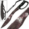 Featuring a unique and vivid Zombie image across the entire blade. Constructed from a solid slab of heavy duty stainless steel, this full tang Kukri machete has 3 parts to its 14.5 inch long stainless steel blade; a pointed tip for stabbing, a wide midsection for chopping, and a narrow area near the handle for whittling and carving. Razor sharp, the blades cutting edge has a silver finish while the body of the blade features a zombie image screen printed across the entire blade. The injection-molded grey and black handle feels soft in your hand, but won't slip when you get sweaty while the guard provides protection for your hand. Comes with a FREE nylon zip fastened sheath as well as a shoulder strap. A stamp on the blade reads Biohazard Zombie Survival Gear.