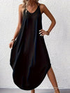 This solid color curved hem suspender dress is a sexy sleeveless spaghetti strap loose long dress, perfect for women's clothing. The dress length is mid-calf and it is made of polyester with medium stretch elasticity.