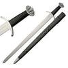 If you were to challenge a Viking to battle, you would likely wind up facing a sword just like this Black Viking Warrior Sword. Rugged and hardy looking, this weapon recreates the iconic appearance of the Vikings classic weapon in stunning detail. The stainless steel blade is wide, with a gradual profile taper and a shallow fuller. This combination gives the weapon good balance, as well as a rounded point that puts more percussion behind every strike, while still preserving some thrusting ability. The silver cast-metal guard has a gentle downward curve towards the blade, although the guard is kept intentionally small, in true historic Viking style. The one-handed grip is wood with black leather wrapping, while the lobed pommel completes the look of this sword nicely. Included with the sword is a matched black-leather wrapped scabbard, complete with silver-metal furnishings on the chape. For a Viking, there is no better weapon to wield then a sword like this one, and that makes this Black Viking Warrior Sword a solid addition to your costume arsenal, as well as to your medieval collection!