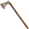 This is a terrific war axe for display or theatrical use. It has a sharp edge and can also be used as a throwing axe. A 4.75 wide, Cast Iron steel head is mounted on a hardwood handle and the blade edge measures 3.5 from point to point. Overall length with handle is 16.75