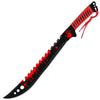 A trio of cutouts lighten this blade, while its wider tip puts more force into every strike.  The soft wrapped handle, serrated spine and a notch guard above the handle make sawing any zombie's head off a breeze.  Red blood like splatters and hand print on the black stainless steel blade add authenticity to this machete.
