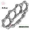 Skeleton Bones 'Bad to the Bone' Knuckle Duster Solid Steel Paperweight - Silver/Chrome. Commonly referred to as 'Brass Knuckles', these are Heavy Duty Belt Buckles, or paperweights... designed with 'intended use' is to hold up your pants, or really windy days. Solid metal construction and 4 finger holes each boasting bones on the front, which will leave a lasting impression.
