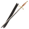 Claymore Sword. Brass guard and pommel. 28" overall. 22" unsharpened stainless blade. Wood handle. Includes Black leather scabbard.