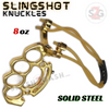 Sling Shot Brass Knuckle Duster Paper Weight Solid Steel w/ Gold finish. Commonly referred to as 'Brass Knuckles', these are Heavy Duty Belt Buckles, or paperweights. Your enemies will know you mean business when you are geared up hard core with these heavy duty sling shot knuckles. Unique and eye-catching design with circular finger holes, made of solid steel. Easy to put together (3 Pieces and 1 screw), everything needed is included. *Some pieces have rough edges, inspect before using