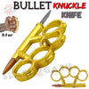 Gun Themed Bullet Knuckle duster w/ Hidden Folding Knife - Gold finish cartridge 7.62 x 54 caliberwith copper tip. Commonly referred to as 'Brass Knuckles', these are Heavy Duty Belt Buckles, or paperweights. The Undead will know you mean business when you are geared up hard core with these stylish multi-purpose assault rifle bullet knuckles. Removable peg which can be physically worn, then transforms when you need to pew pew and slicey dicey... how cool is that?