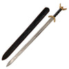 The Celtic War Sword has a stainless steel blade with a fuller running almost its entire length. Half moon shapes with polished brass finishes make up the guard and pommel, together forming the likeness of a stylized human figure. A wood handle, contoured for a more comfortable hold, separates the guard and pommel. A hand-stitched, leather sheath is included with this Celtic weapon, making it easy to safely store the blade or carry it with you on a belt. This historical Celtic replica makes a lovely display piece for collectors, enthusiasts, and more, as well as a fun weapon to carry at your side.