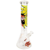 Lighten the mood with your favorite quotes from this iconic stoner duo! The Parked Beaker Bong from Cheech & Chong Glass is made from thick borosilicate glass with a classic beaker style chamber that's ready for ragin' rips of smoke. The neck is decorated with a movie quote in groovy lettering with a hemp leaf shape next to the profiles of these two best buds; their golden signatures and branded logo decorate the chamber. A slitted downstem diffuser produces rumbling water filtration as you inhale and a 3 pinch ice catcher is great for rapidly cooling smoke. Each bong includes a separate downstem, a 14mm male herb slide, and a branded sticker, all packaged in a themed gift box.