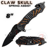 Serrated Drop Point Spring Assist Rescue Folding Pocket Knives with Skull Single Edge Black Blade and 3D Claw Cutouts and Orange Liners. Yep, it's pretty much bad ass!