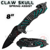 Serrated Drop Point Spring Assist Rescue Folding Pocket Knives with Skull Single Edge Black Blade and 3D Claw Cutouts and Dark Green Liners. Yep, it's pretty much bad ass! Specifications: