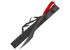 This is the Corpse Slayer Apocalypse Full Tang Ninja Sword. This is one solid piece of cold, hard, stainless steel with heat treated black anodize baked finish. The blood red nylon cord wrapped handle adds a sleek stylish look with easy maneuverability while the blade offers a neon green imprint of Corpse Slayer Recovery Crew with the bio-hazard symbol in the middle which means its only meant for Undead Killing. The wicked blade is constructed with fantasy cut outs, teeth like serrations, and a piercing point to help with strategic killing of living corpses during the Apocalyptic hours. It slides superbly into a durable black nylon blade sheath with an adjustable shoulder strap. It has a 27 inch overall length.