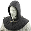 Made from 100% heavy cotton, padded with three layers of wool felt and lined with cotton to add life to the garment, this Cotton Padded Collar Armor And Cap provides protection for both the face, neck and shoulder area. Designed to provide full comfort and freedom of movement, a front buckle makes the collar easy to be worn and taken off while a high collar adds to the protection. It also comes with leather straps, with which it can be reinforced. Padded garments are worn underneath metal and chain mail armor to improve the absorption of impact and reinforce coverage. In medieval times, padding would be stuffed with rags and straw but this armor padding is made of 100% cotton and uses compressed and layered cotton padding.