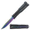 The Clip Point Creature Comforts balisong is sharp with tons of attitude. Measuring at 9" inches overall, the rainbow finish stainless steel blade is perfect for everyday carry. The latch locks the handles in both the open and closed positions to avoid any accidental openings or closings. Fun and lightweight for trick/flipping use.